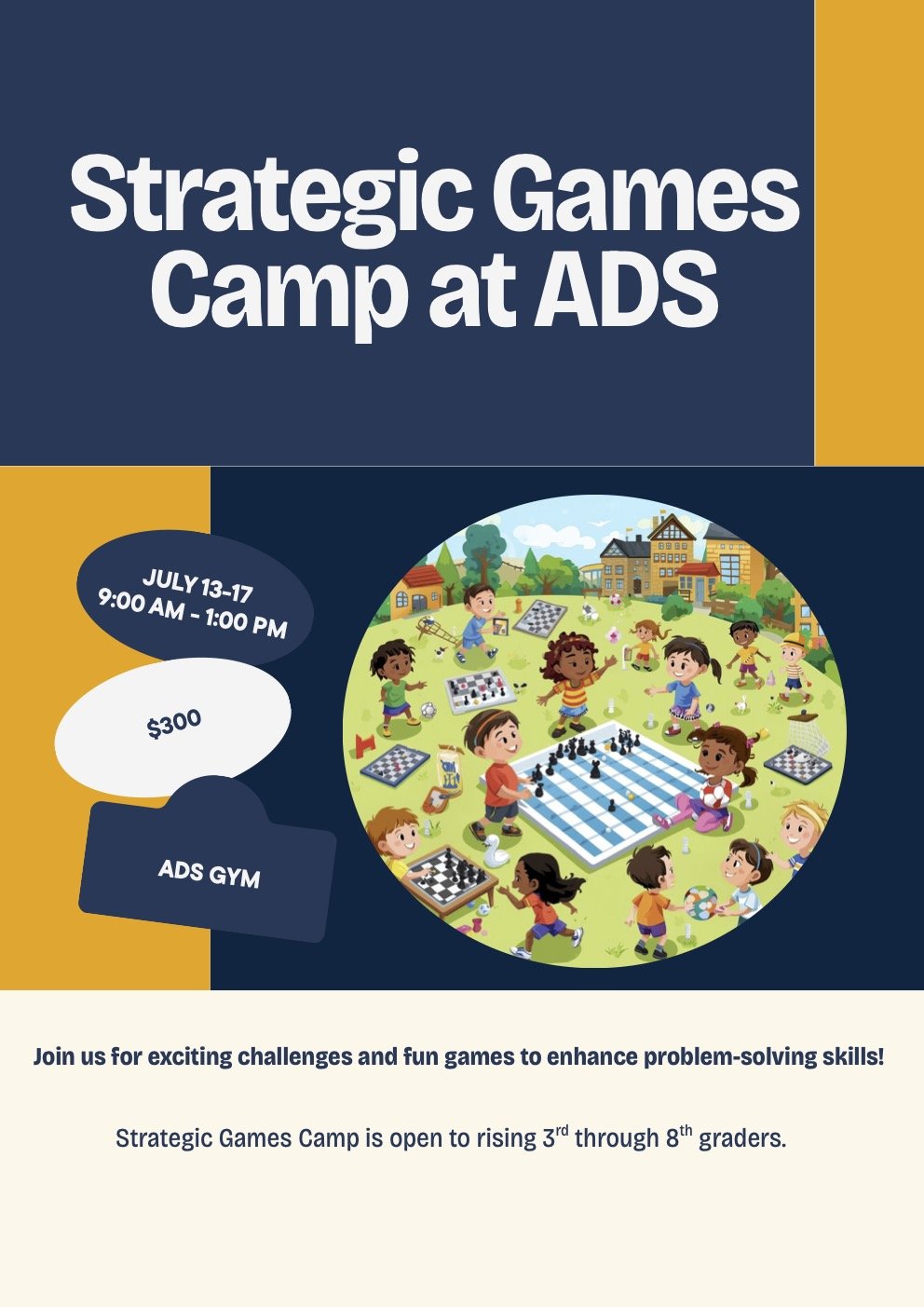 Join us for Strategic Games Camp, a fun and engaging summer experience for rising 3rd through 8th graders, running July 13–18 from 9:00 AM to 1:00 PM at ADS. Led by Lauren Davis (4th–5th grade math teacher at ADS) and Dan Davis (7th–8th grade math teacher at Cliff Valley), students will build mathematical thinking and strengthen problem-solving skills through strategy-based games in a supportive, engaging environment.